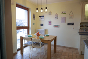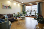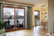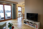 W całym mieszkaniu jasny, dębowy parkiet,, w przedpokoju i kuchni terakota. Drewniane, brązowe, wysokie okna idealnie wyciszają wszelkie dźwięki. Wszystkie drzwi wewnętrzne z drewna w kolorze mlecznej bieli optycznie powiększają przestrzeń i nadają wnętrzu klasyczny wygląd.