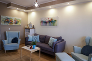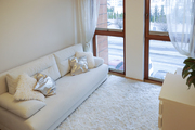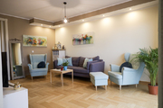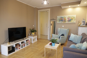 Salon jest pięknie doświetlony w ciagu dnia dzięki dużym oknom. Podłoga z jasnej, dębowej klepki ułożona w jodełkę, wycyklinowana i polakierowana (półmat).