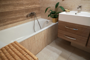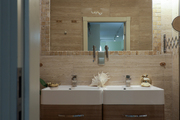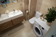 Duża łazienka z dwiema umywalkami, wanną i miejscem na dużą pralkę i suszarkę wyłożona jest beżowo-brązowym kamieniem (trawertyn), który zapewnia ponadczasową elegancję.