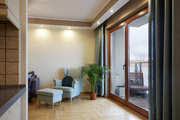 Salon z elektrycznym kominkiem i porte-fenetre prowadzącymi na 4 metrowy balkon, na którym można cieszyć się południowym słońcem, jest częściowo połączony z kuchnią.
