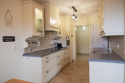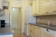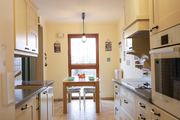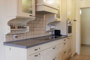 Kuchnia posiada wejście z hallu i jest częściowo oddzielona od salonu, dzięki czemu czynności kuchenne nie są bezpośrednio widoczne. Urządzona jest w klasyczny sposób, eleganckimi drewnianymi meblami w kolorze waniliowym oraz kontrastowymi grafitowymi blatami z konglomeratu. Jest wiele przestrzeni do przechowywania oraz duża płyta indukcyjna.