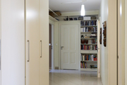 W hallu wejściowym umieszczono dużą, pięciodrzwiową szafę wnękową, ze sprytnymi schowkami np. na rower, walizki itp.. Część hallu zajmuje również biblioteczka z jasnego drewna, która swietnie nadaje się do eksponowania książek lub domowych kolekcji.