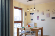Jadalnia z wysokim oknem jest dostępna zarówno z kuchni jak i z salonu, co doskonale ułatwia życie rodzinne i towarzyskie.