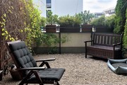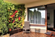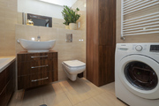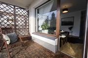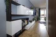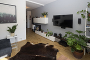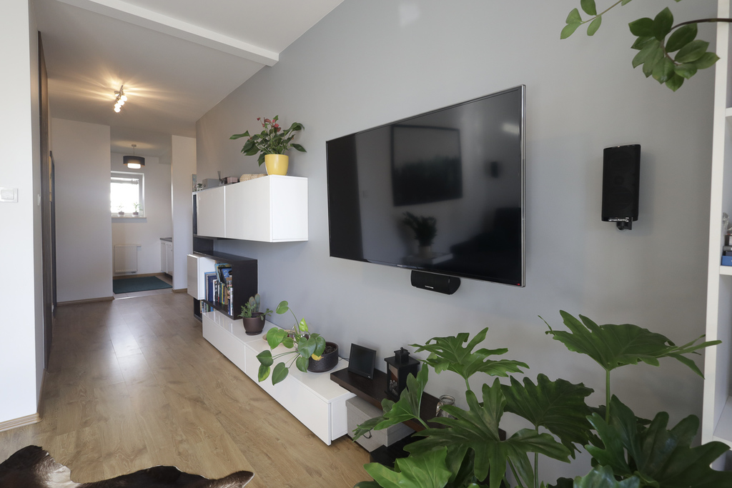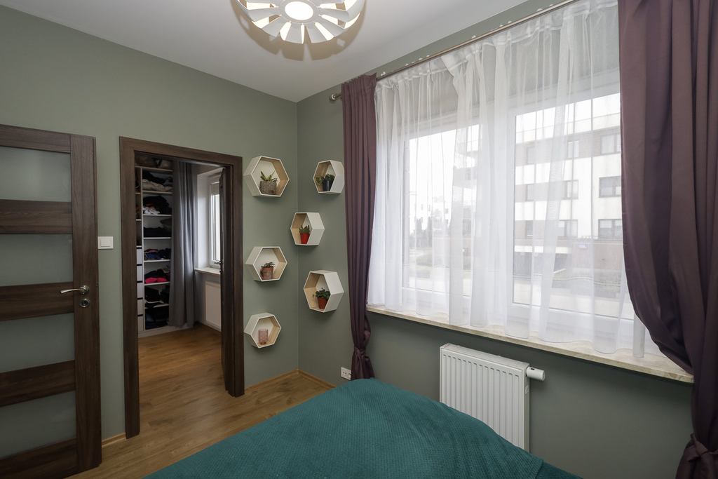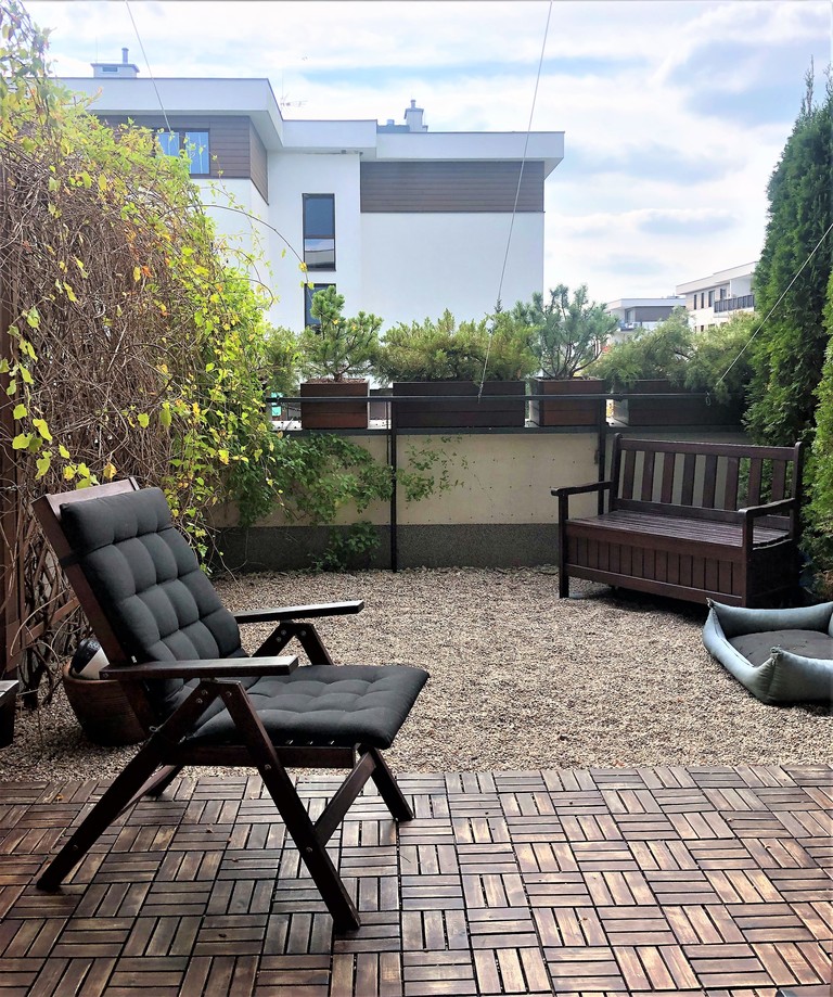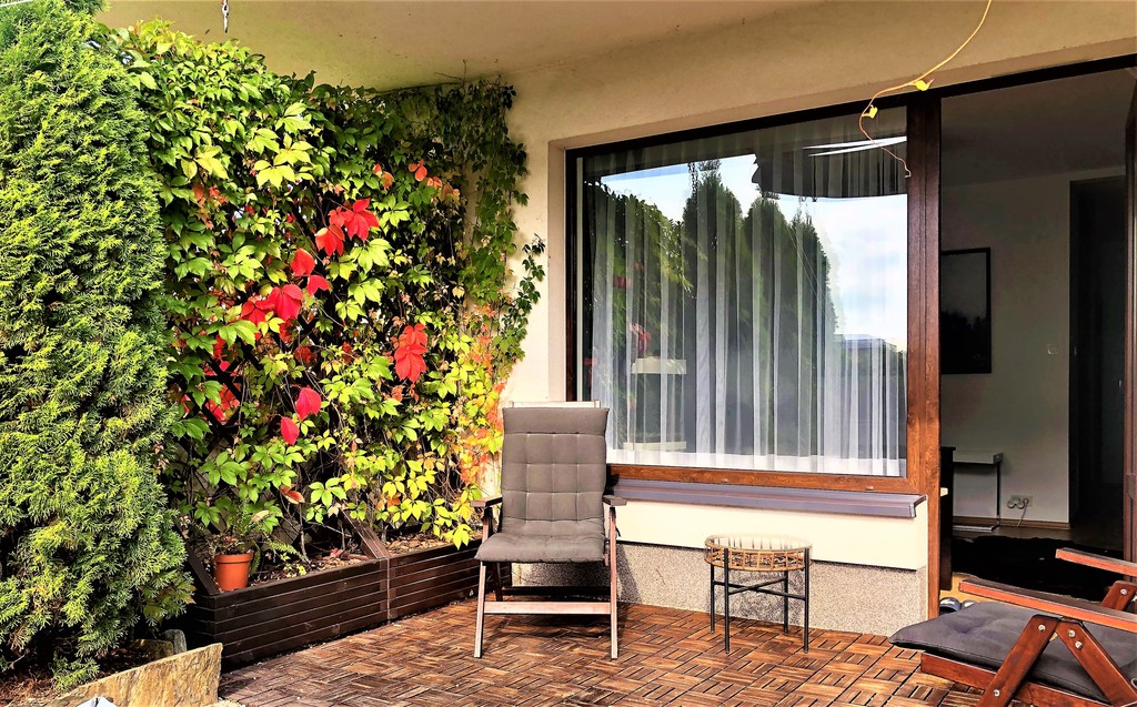 Salon z ogromnym oknem pozwala cieszyć się ciszą, miłe chwile można spędzać na tarasie i w ogródku, które łącznia maja powierzchnię 20 m2. Duża markiza przyda się w słoneczne dni, bo ogródek jest skierowany na zachód. W salonie telewizor i kino domowe Harman Kardon/Marantz. Dwie sypialnie z oknami wychodzącymi na północ dla wytchnienia od słońca. W jednej z sypialni urządzono dużą garderobę i miejsce do ćwiczeń. W łatwy sposób można przywrócić wejście z hallu i urządzić w niej pokój do pracy lub pokój dziecinny. Niewielka kuchnia z oknem skierowanym na wschód jest wyposażona we wszystkie niezbędne sprzęty agd. Wygodna łazienka z wanną i pralką.