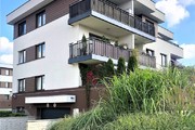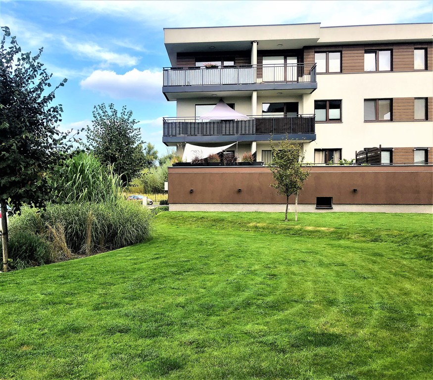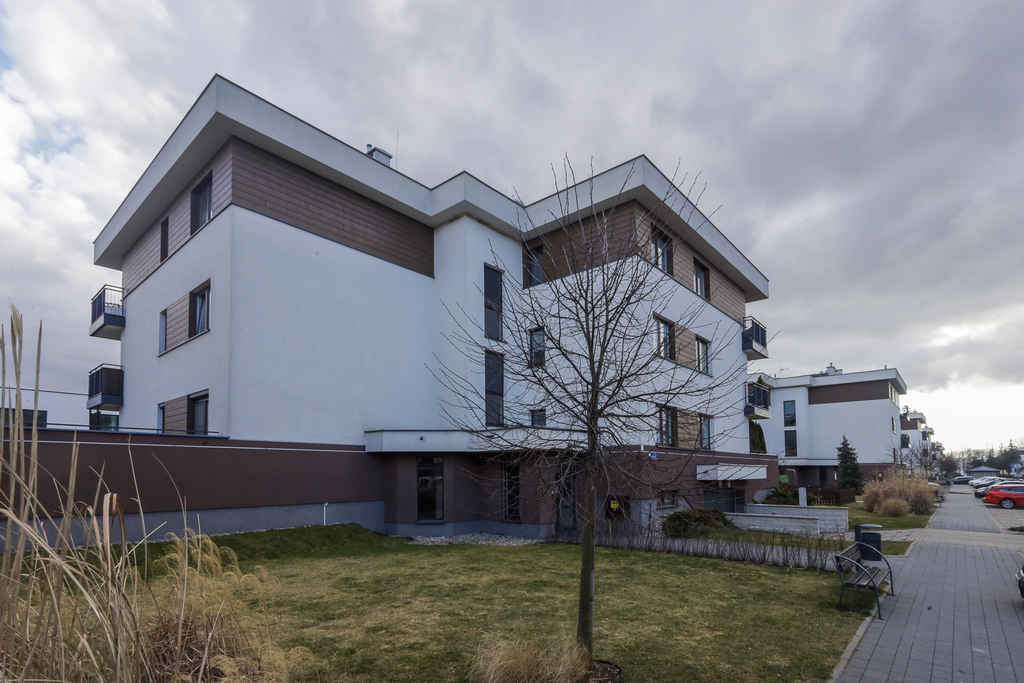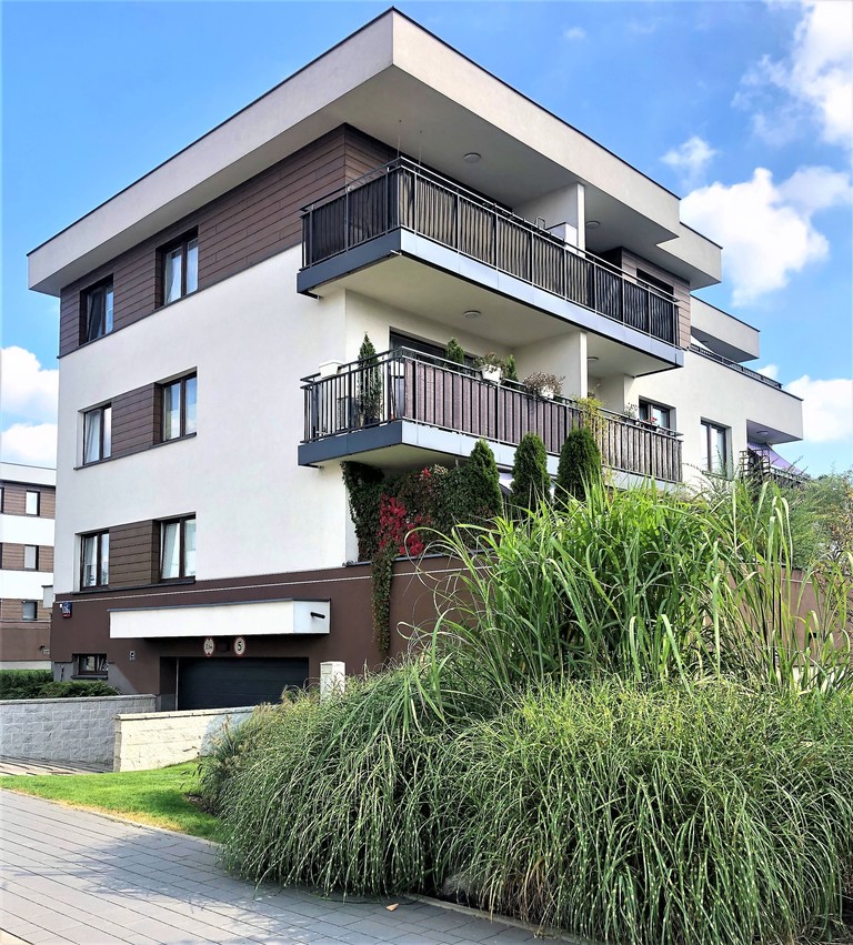 Budynek dwupiętrowy z garażem podziemnym, na każdym poziomie po 5 mieszkań, łącznie 15 mieszkań w budynku, winda z garażu dojeżdża na poziom mieszkania, aby ułatwić transport np. zakupów. Do mieszkania prowadzą schody ok pół piętra, na wysoki parter, dzięki czemu taras jest wyniesiony ponad poziom terenu, można także pokonać tę wysokość wygodną windą.